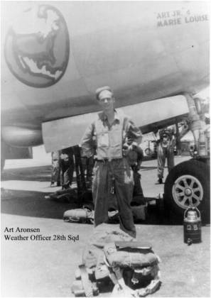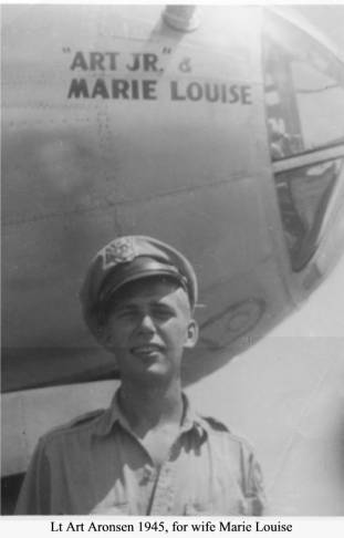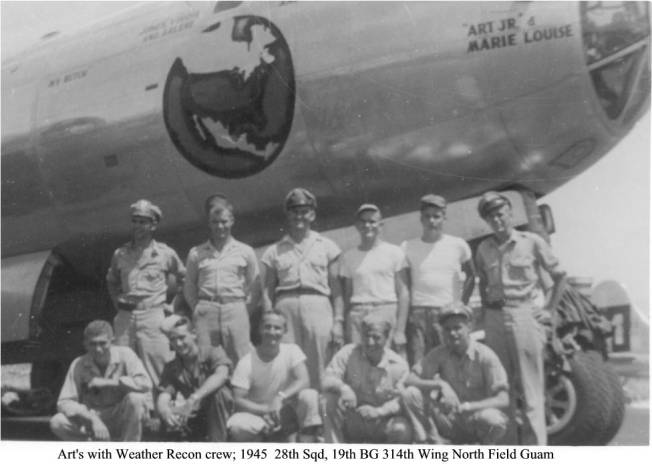 Art was the Weather Officer, flying to the north west of Japan to gather data for weather forecasts. They carried no bombs, just extra fuel in bombay tanks for long range. Art is Sec of the 19th BG Association and Marie Louise, on the plane, is his wife and companion at the reunions. The following note is from their radio operator: