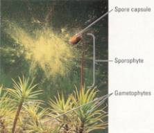 simple plants growing on rocks, rotting logs, trees, roofs, or gravestones