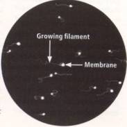 Lipid Membranes self-assemble from fatty acid molecules dissolved in water. The membranes start out spherical and then grow filaments by absorbing new fatty acids (micrograph below). They become long, thin tubes and break up into many smaller spheres. The first protocells may have divided this way.